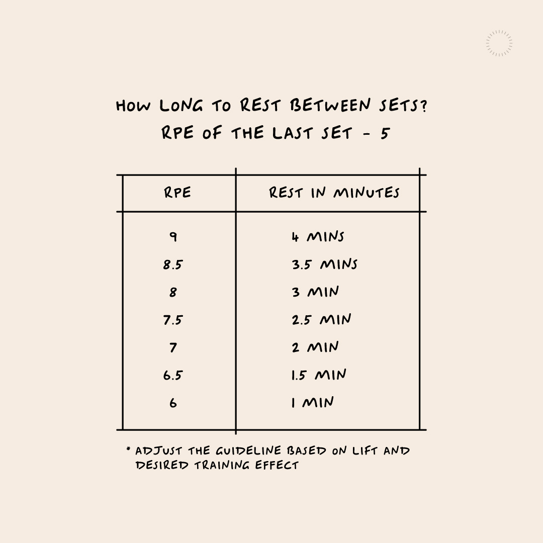 The guideline goes like this. Subtract 5 from the RPE of your last set to determine rest time in minutes. If a set is RPE 8 (meaning you had 2 reps left in the tank), you’d rest 3 minutes. If it were RPE 6.5, you’d rest 1.5 minutes.